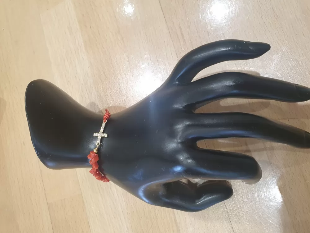 bracelet réglable sur cordon une partie corail véritable avec croix vermeil et zirconium la couleur du cordon peut changée