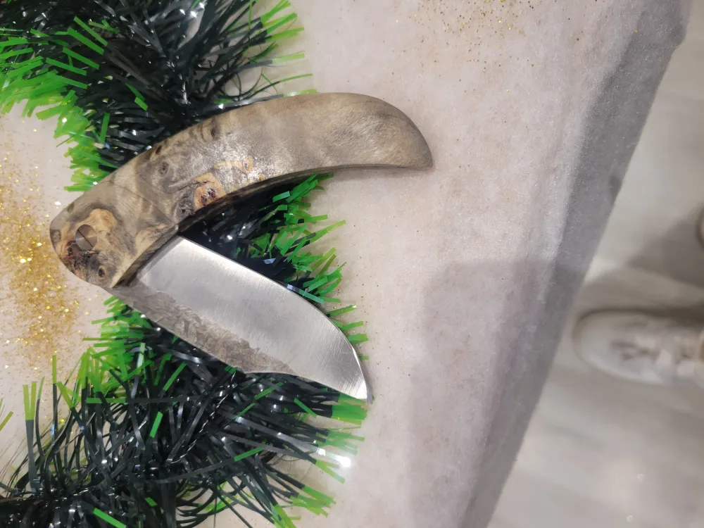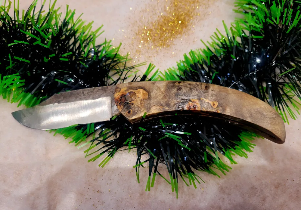 Couteau pliant en loupe de peuplier lame acier xc 75 forgée vendu avec son étui créer par un coutelier de porto vecchio